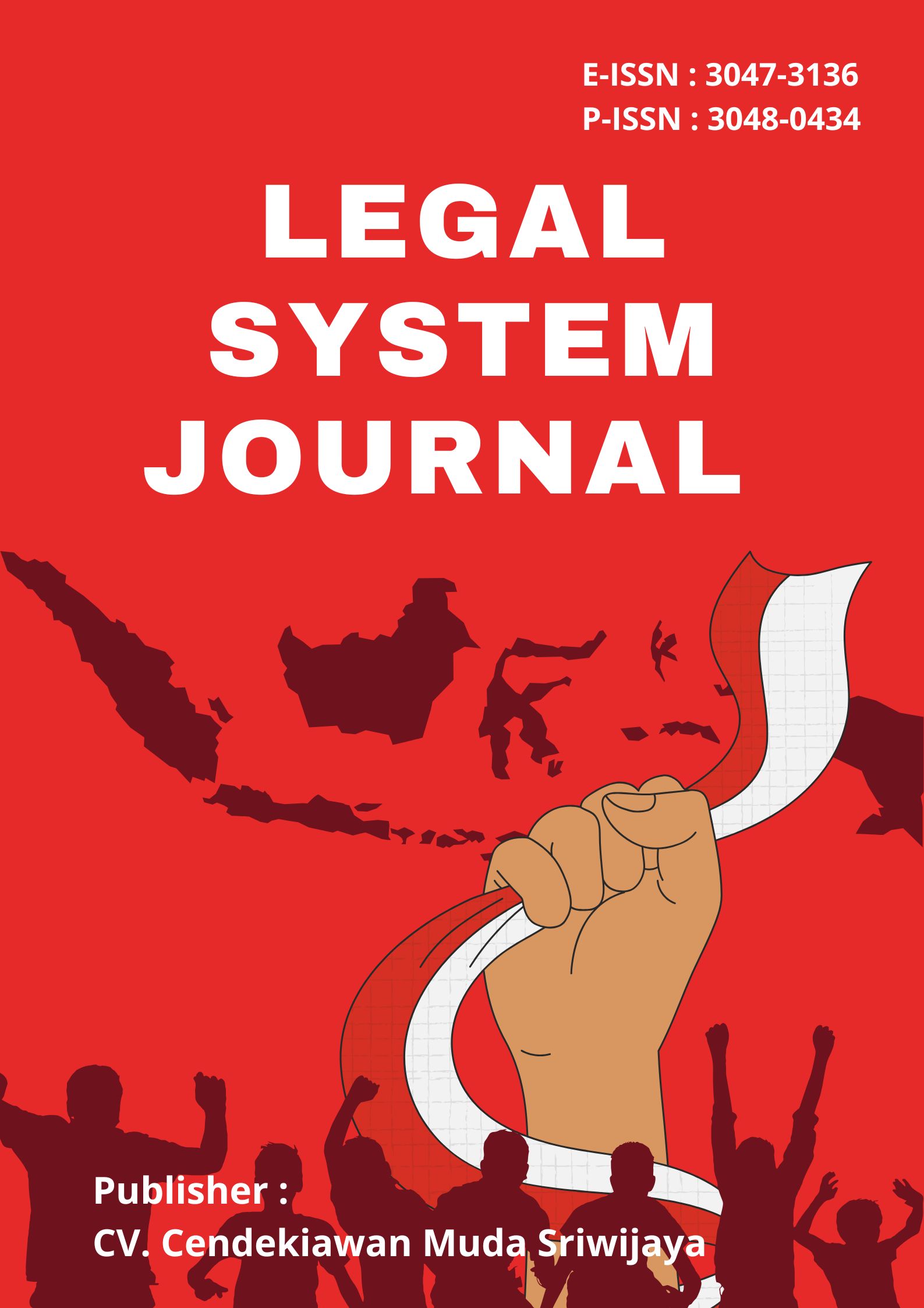 Legal System Journal is a periodic scientific journal managed by CV Cendikiawan Muda Sriwijaya. Translated into English, Legal System Journal means a legal system journal. The name of this journal is inspired by the views expressed in one of the writings of a legal scholar in the national and international arena, namely Lawrence M. Friedman, namely the Legal System. The legal system, at its core, consists of Legal Structure, Legal Substance, and Legal Culture.